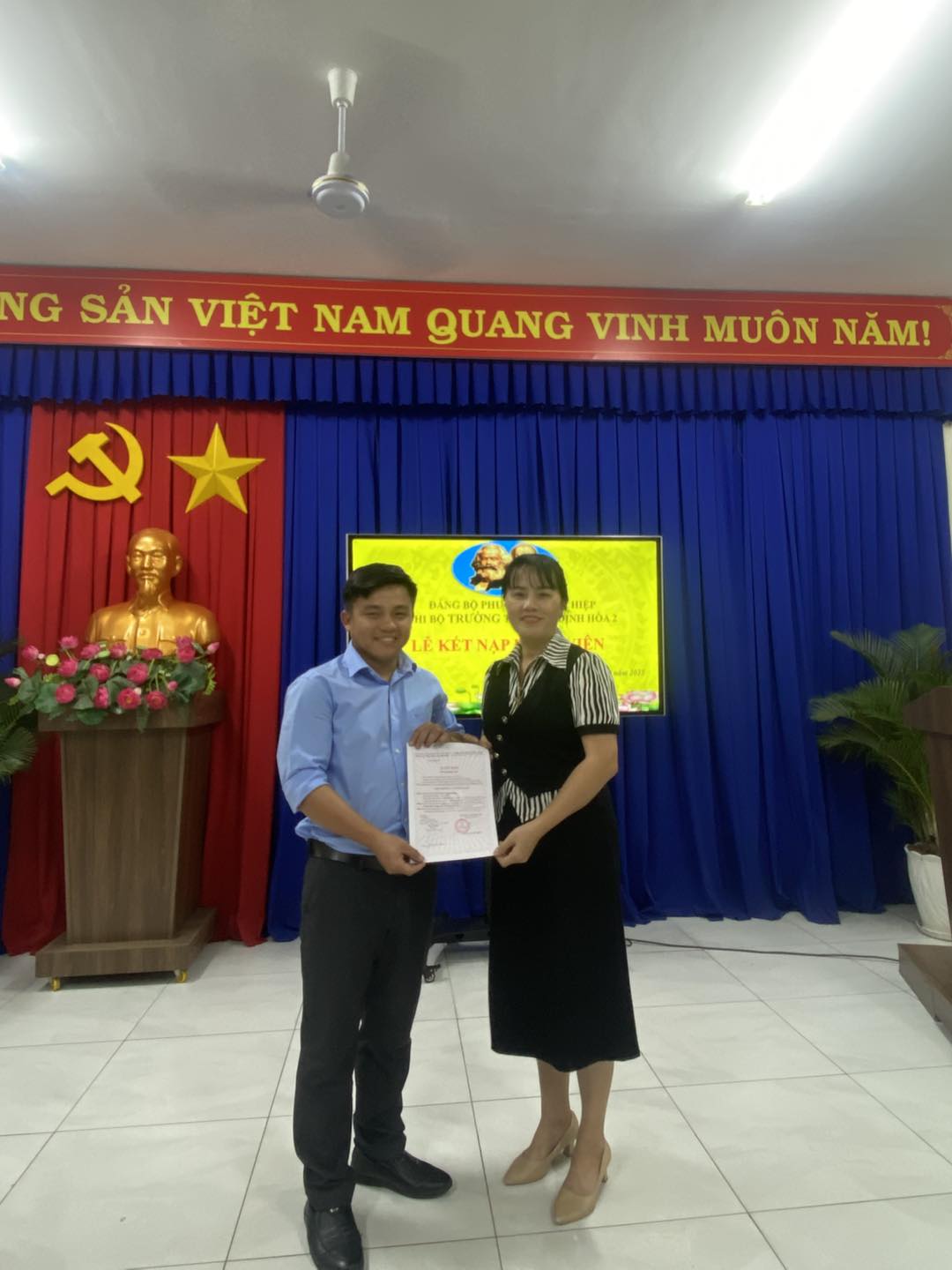 Chiều ngày 19/12/2025 Chi bộ trường TH Định Hoà 2 tổ chức kết nạp đảng cho quần chúng Huỳnh Quốc Thắng và trao quyết định đảng viên chính thức cho 2 đồng chí Nguyễn Ngọc Huyền Trâm và đồng chí Đỗ Thị Anh Thư
